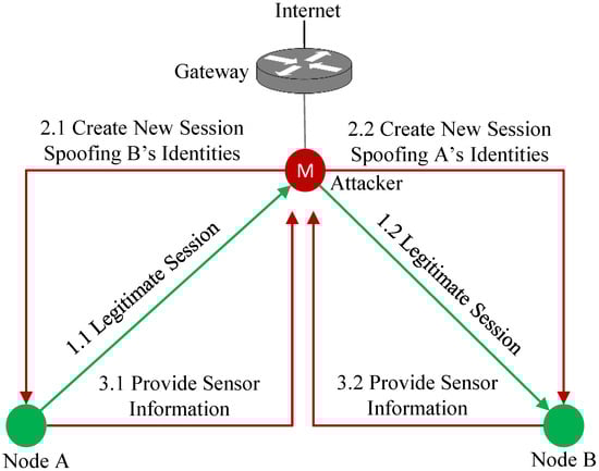 Man-in-the-Middle: In the Man-in-the-Middle (MITM) attack, a malicious IoT node sits between two victim nodes and tricks them into thinking that they are communicating with each other. Figure 7 shows an example of the MITM attack in the RPL network. A malicious node M spoofs the identities of node A and B. Node M establishes a session with node A impersonating Node B and initiates another session with node B impersonating node A. Hence, Node M tricks Node A and Node B into providing sensor information.