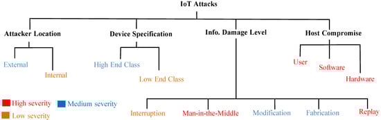 In this section, we present a classification of IoT attacks. We classify the attacks based on the location of an adversary, the types of devices that can be used in attacks, level of information damage in attacks, and techniques used for compromising credentials.