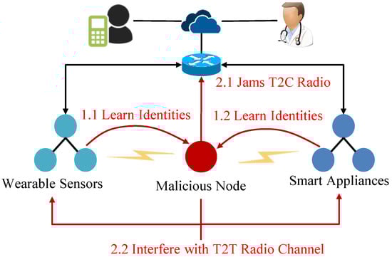 High-End Device Class Attack: Malicious devices used to perform attacks have more resources—such as CPU speed, storage capacity, network bandwidth, and battery power—than a target device has. An attacker can use desktop, laptop, and cloud PCs to perform attacks on IoT networks and smart devices. The attacking device can be either co-located with the target device or positioned outside of the network of the target device. An adversary uses the high-end devices to perform attacks that increase the resource utilization of a victim device [,]. An attack scenario for a high-end device attack is as follows. An adversary sends a large number of malicious requests to the target device in a very short period. The target device keeps allocating resources to process the malicious requests and eventually suffers from resource exhaustion, such as memory overflow and reduced battery life. As a result, the target device cannot handle legitimate requests or send time-sensitive sensor information to its users due to resource unavailability. Although an attacker’s goal is to stop a target device from providing services by exhausting its resources, the adversary uses a high-end device as an attacking device to avoid such resource exhaustion while performing attacks.