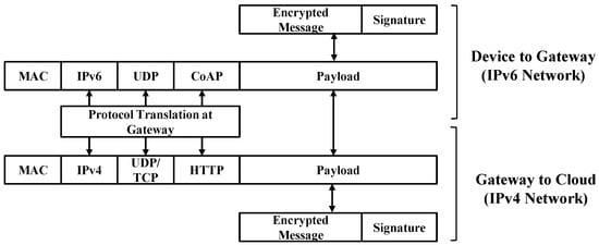 Vulnerable Multi-Protocol Connectivity: An IoT system comprises various types of networking protocols and communication links, including wireless, wired, intranets, and Internet [,]. A vulnerability in one networking protocol can be propagated to another protocol during cross-protocol communications. Moreover, the privacy and confidentiality of sensor information can be breached during the protocol translation performed by the Gateway. A Gateway device translates IPv6 packets to IPv4 packets when an IoT device exchange messages with a cloud server. A malicious Gateway device can learn about the payloads while performing the protocol translation. As a result, communication between the heterogeneous networks is vulnerable to various attacks that can be a threat to the violation of information privacy and confidentiality.