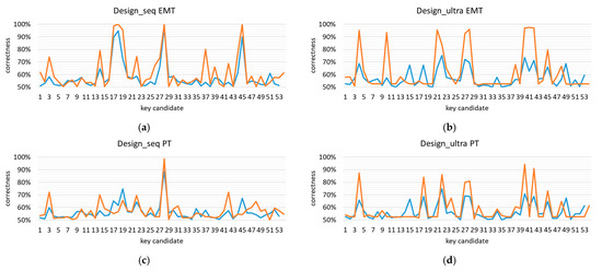 - Design_ultra is a specific instance of our ECSM design that was compiled with the Synopsys Design Compiler using the compile_ultra feature. This high-effort compilation process involves logic-level and gate-level synthesis and optimization, aiming to achieve an optimum quality of results. The compile_ultra feature leverages all DC Ultra capabilities, balancing timing and area limitations to deliver a compact circuit that meets stringent timing criteria. The exhaustive compilation enhances synthesis quality, resulting in improved performance, reduced design area, and lower power consumption. Design_ultra was manufactured into an ASIC. in the IHP 250 nm technology [51]. The compile options increased the resistance of the design against SCA attacks. The authors applied a non-profiled horizontal statistical attack—the comparison to the mean, which is a univariate attack on each clock cycle of the ECSM iteration, capable of leveraging only the first-order leakage—and achieved 76% correctness for the power trace (PT) and 77% for electromagnetic trace (EMT) for one of the candidates. We use their attack as the first step in our analysis.