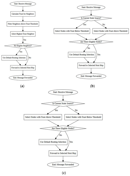 - Chang, M.; Chen, I.-R.; Bao, F.; Cho, J.-H. Trust-threshold based routing in delay tolerant networks. In Proceedings of the Trust Management V: 5th IFIP WG 11.11 International Conference, IFIPTM 2011, Copenhagen, Denmark, 29 June–1 July 2011; Proceedings 5. Springer: Berlin/Heidelberg, Germany, 2011; pp. 265–276. [Google Scholar]