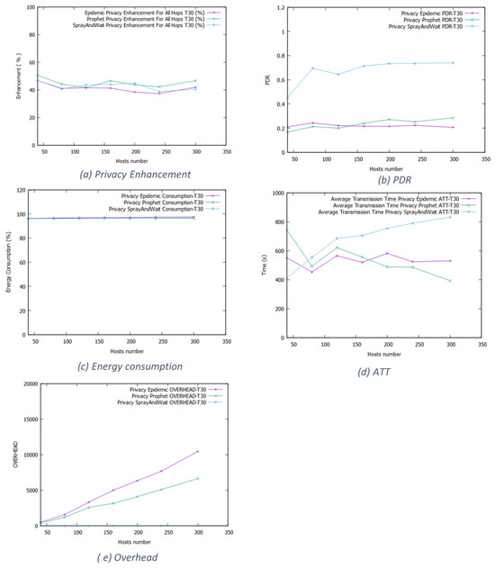 Figure 17 shows that the privacy enhancement in Epidemic overpasses 20%, rises to 50%, and then slows down to 20% for larger networks, while in Prophet, it gains up to 60%. The Spray and Wait protocol is improved by 20% in a small network compared to the normal routing, by 40% with medium size, and back to 20% with a larger network and, consequently, has the longest delivery time.