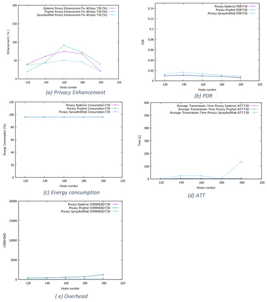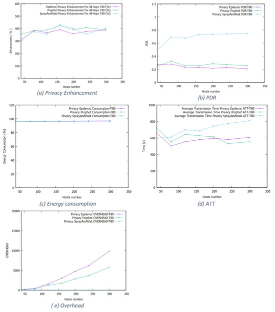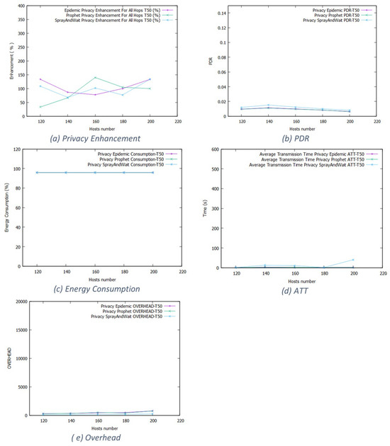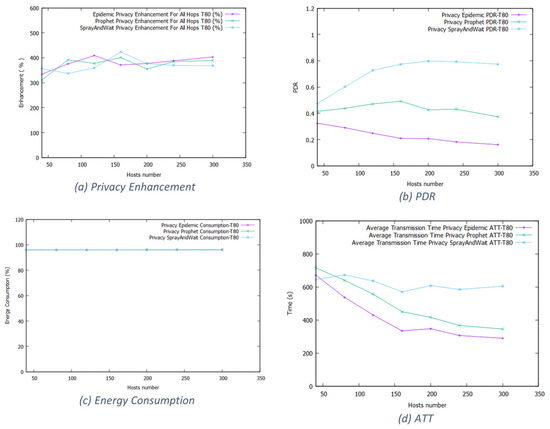 Figure 11 shows the working day movement model results for the 80% threshold. In Epidemic, it starts at 250% for small networks and increases when we increase the network size. For Prophet, the enhancement varies between 200% and 400%. Spray and Wait also has a high privacy enhancement rate. The wide space and long duration limit increase the forwarding opportunities, degrading the network performance.