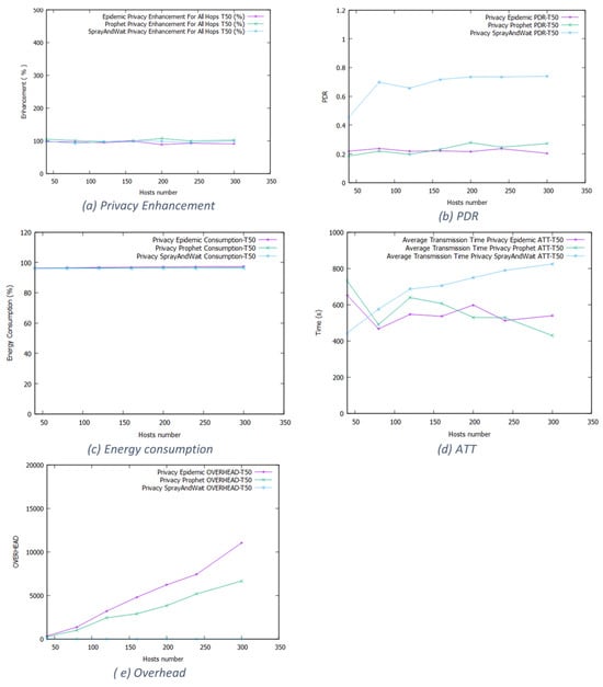 Figure 6 presents the result with the random way model. The routing schemes maintain the same behavior. More specifically, using a threshold of 50% forces mobile nodes to select closer hosts, resulting in better privacy preservation. A larger network means more opportunities for message forwarding. Therefore, the probability of meeting good candidates who satisfy the privacy preservation criteria increases with the number of hosts in the network. We observe a 100% enhancement in privacy with minor degradation in the network performance except for the transmission time for Epidemic and Prophet, which slightly increased due to the restriction about relaying nodes. Spray and Wait gives the best packet delivery rate with a distinct weakness in its delivery time.