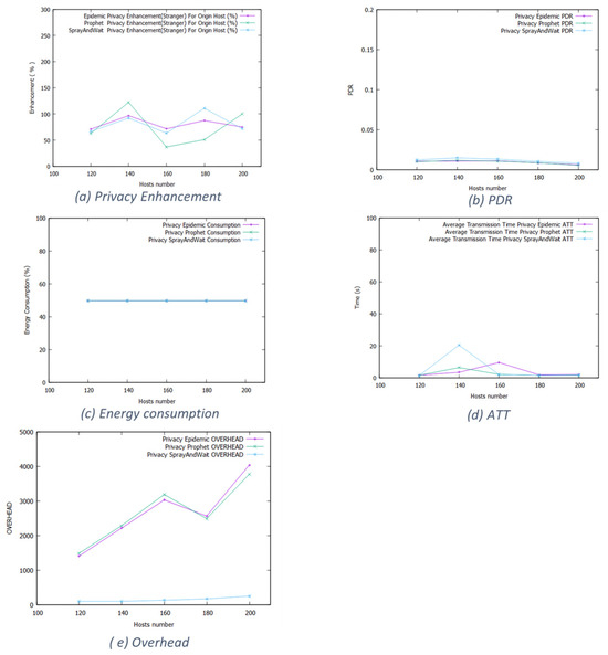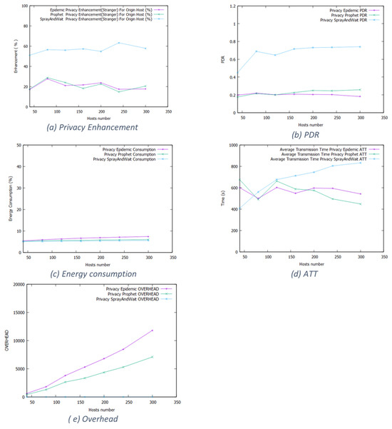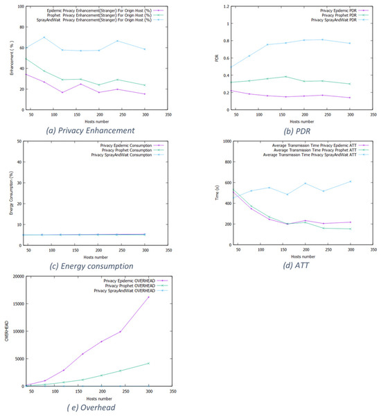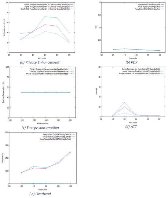 Figure 14 shows that for Epidemic, Prophet, and Spray and Wait, the privacy enhancement fluctuates around 60%, 50%, and 50%, respectively. For network efficiency, the long duration and large space of the working day movement model influenced the performances; the privacy-aware based protocols almost have the same energy consumption level and PDR. Even for the delivery time, the Spray and Wait protocol generates the same time as the others. Clearly, the working day model eliminates any advantage of the different routing schemes. In Epidemic, the packet number increases significantly for packet overhead due to the fewer forwarding opportunities, forcing the nodes to keep the messages much longer.
