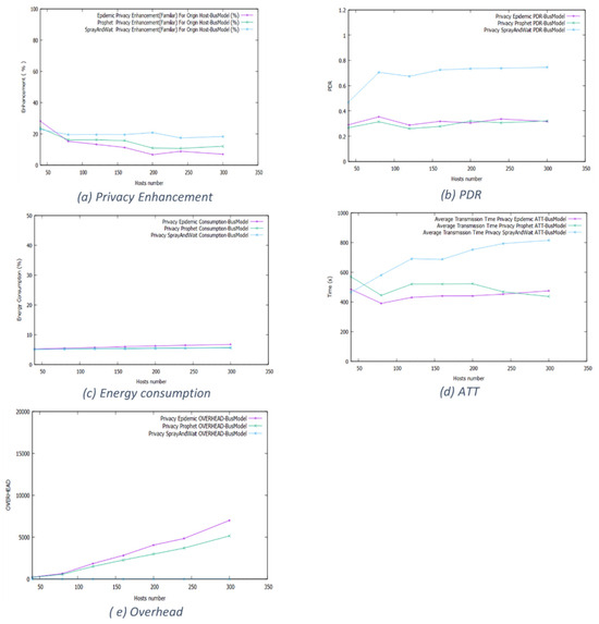 Figure 10 shows the bus movement model results confirming the precedent results. The threshold value is the key parameter that controls the rate of privacy improvement and network performance. While Spray and Wait achieves a privacy enhancement rate of 300%, it has the highest PDR and ATT over other protocols.