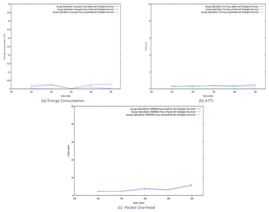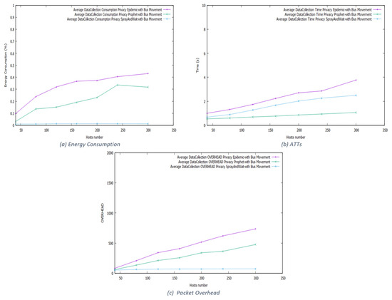 To evaluate the “data collection” process, we defined simulation scenarios based on the protocols and movement models used in the previous experiments. We run privacy-aware routing in each scenario with a data collection process activated. We measure the following metrics: energy consumption, the average transmission time (ATT), and the overhead, which measures the average number of used packets for each node in the network during the “data collection process”—following the results organized by the movement model.