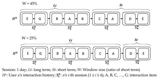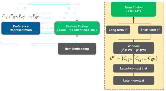 To facilitate personalized recommendations, the session-aware recommender system (SARS) was developed [7]. SARS involves recommendations comprising multiple sessions [8,9,10,11]. Personalized recommendations typically rely on the user’s current interaction to infer their short-term behavioral intentions. While short-term behaviors significantly influence future interests and are thus considered short-term preferences, sessions too distant from the short-term period are classified as long-term preferences. Users have both long-term and short-term preferences integrated into their overall intention preference for recommendations [1,11]. This method’s limitations include overlooking context information and a rigid definition of short-term preferences based on the last session, which can limit recommendation adaptability.