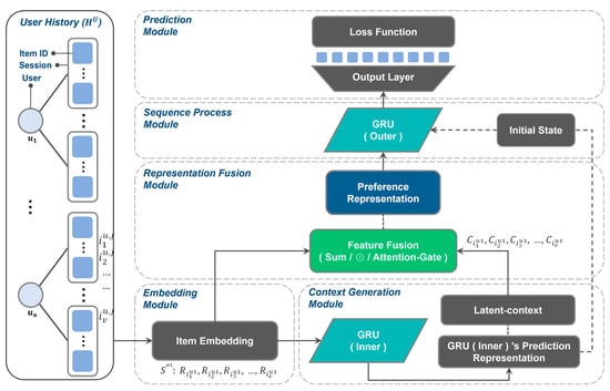 The output from the embedding module constitutes the input for the context generation module. The primary objective of this module is to identify and capture latent-interactive information, herein referred to as ‘Latent-context’. The process for generating this content information commences with the input of the embedding-transformed representation into a GRU, designated as the GRU (Inner). That is, , , …,, goes through the GRU (Inner) and produces the latent context … . Within this neural network framework, user information is subject to a learning process.
