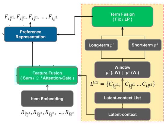 Figure 4 demonstrates the representation fusion module in LCII-Post. Contrasting with LCII-Pre, the LCII-Post applies a post-combining strategy. This involves processing the latent-context embedding in the term fusion after the feature fusion process. The module operates by first engaging in feature fusion with item embedding, followed by the subsequent incorporation of the latent-context embedding. This sequential integration offers a distinct approach to synthesizing user interaction data into a cohesive preference representation. The preference representation serves as the input to the Outer GRU in the subsequent module, as described next.