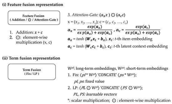The item embedding and the latent context produced by the two modules are subsequently utilized as inputs for the representation fusion module. The aim of this module is to combine the two representations to derive a unified user preference representation. As shown in Figure 5(i), feature fusion generates its representation by combining the item embedding (denoted by xt) and the latent context embedding (denoted by ct) at the t-th interaction for the whole interaction history, using one of three ways: vector addition, element-wise vector multiplication, and the modified attention-gate mechanism [9]. Vector addition sums corresponding vector elements. Element-wise vector multiplication entails the multiplication of corresponding elements in the vectors. The modified attention-gate mechanism [9] merges elements through multiplication of the weighted item vector denoted by αxx (where x = (x1, x2, …, xv)) and the weighted (latent) context vector denoted by αcc (where c = (c1, c2, …, cv)). The attention weights for items and latent context, denoted by αx and αc, respectively, are computed using a common relevance-based attention formula.
