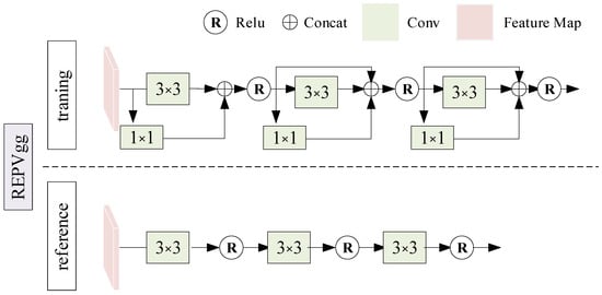 As illustrated in Figure 2, the defect identification network is composed of two main components: the backbone and the head. The backbone is responsible for feature extraction, while the head is employed for prediction. The input images undergo preprocessing to align them into RGB images of size 640 × 640. These processed images are then fed into the backbone network. Based on the three-layer output from the backbone network, the head layer continues to produce three layers of feature maps with different sizes. Through RepVGG blocks, the network performs predictions for three tasks related to image detection, including classification, foreground–background classification, and bounding box prediction, ultimately generating the final results. Inspired by the YOLOv7 model, model reparameterization is introduced into the network architecture, and a multi-branch network is adopted to enhance feature extraction []. An attention unit is incorporated into the model to effectively extract subtle features that are challenging to identify. The introduction of the REPVGG module (as shown in Figure 3) strengthens the network’s ability to extract crucial features [].