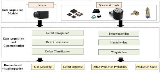 Figure 5 illustrates the experimental verification process. Initially, cameras and various functional sensors are employed to gather environmental and slab image data. Subsequently, the defect recognition algorithm is applied to determine the location and category of slab defects. The identified defects with the data acquired from various functional sensors are integrated, enabling the modeling of slabs along with defects and the establishment of a defect database. Additionally, this integration allows for predicting the probability of defect occurrence and monitoring production data.