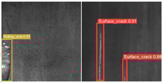 Upon completion of training of the aforementioned models and the proposed model, a total of 5000 in situ slab images were collected for testing. As shown in Table 1, the evaluation metrics for different SOTA models and the proposed model were computed. The results demonstrate that the preprocessing algorithm proposed in this study significantly improves the recognition accuracy and capability of each object detection model. This suggests that the proposed model, compared to SOTA models, notably enhances the detection accuracy of slab defects. Figure 6 shows the classification, localization, and probability diagram of slab defects identified using recognition algorithms. It can be seen that our algorithm has excellent recognition performance.