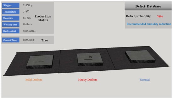 Through experiments, the DT-based slab production process monitoring system achieved real-time synchronization and simulation with the actual production process. In the production process monitoring system, users can achieve a full-angle observation of the slab by dragging and rotating, enabling a comprehensive understanding of defect information. When defects are present, the interface marks them in red or orange based on severity. Red indicates a more severe defect, while orange indicates a less severe one. Users can perform subsequent slab processing, such as repair, re-smelting, or discard operations, according to the color indications. In the upper right corner, the system provides a probability prediction of defect existence. If the probability exceeds 70%, it is marked in red; if it exceeds 50%, it is marked in orange. The system suggests measures to reduce the probability of defect occurrence based on environmental information. Staff can choose to modify relevant environmental factors based on prompts or opt to reduce the current production yield to enhance the quality of slabs. Clicking the defect database button redirects the interface to a detailed information page on historical defects, allowing users to navigate through historical defect information using page-up and page-down buttons. The system database is developed using MySQL 5.7 software, storing all defect data generated during the slab production process in MySQL database tables. Corresponding fields are established based on time, defect category, weight, temperature, and humidity. The system also reserves a secondary development interface for future interaction with big data and artificial intelligence models, aiming to achieve a faster, more comprehensive, and convenient system.