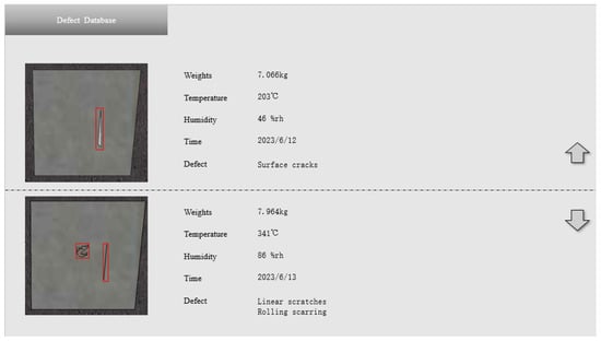 - Defect database module: Illustrated in Figure 8, this module encompasses all historical data on slab defects. Personnel can query defect information, such as the date of occurrence, defect type, temperature, humidity, and weight, through this module.