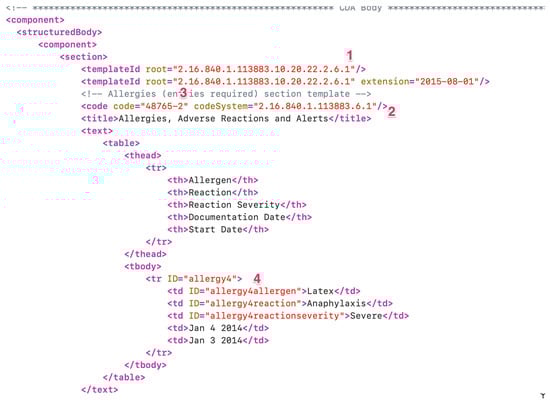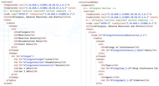 Figure 1 shows a fragment of XML code in a CDA document in which its inner structural complexity can be easily observed. In point (1): the “root” tag indicates the unique identifier of a populated section, following immediately below. Each section differs in the type of its contents and the standard used to populate it. In fact, in order to become acquainted with the actual content of the various sections, you need to access and download all the used types of data structures’ definitions, available from the remote url: https://hl7.org/cda/stds/ccda/draft1/downloads.html, last accessed on 10 January 2024. Point (2), and specifically the “codeSystem” attribute within the “code” tag, shows which dictionary of codes has been used for the labels present in the section, which in this case is the Logical Observation Identifiers Names and Codes (LOINC) dictionary. LOINC dictionary terms definitions have to be accessed separately, which can be performed in one of two different ways: offline, by downloading the entire dictionary and carrying out local searches, or online using the appropriate remote search page, etc. (https://loinc.org/, last accessed on 10 January 2024). At point (3): the “code” tag value encodes the subsection used within the LOINC dictionary. In point (4), we find a tabular list of actual key–value data pairs and their “ID” attributes, which represent custom defined identifiers that can be used as references to this data from other parts of the CDA file. Additionally, another source of undesired intricacy in CDA documents is actually the way the XML data themselves have been organised at user compilation time. This is clearly shown in Figure 2 which confronts data belonging to the same type of section (allergies) however filled in very different ways, which leads to very apparently different documents, as they have different structures despite the fact that their tags carry the same information once correctly interpreted.
