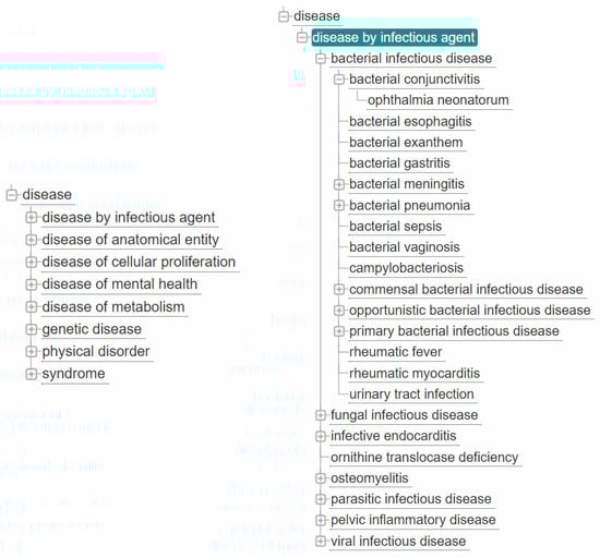 On the left, the main branches of the Human Disease Ontology and on the right some classes that derive from the first disease, or disease by infectious agent.