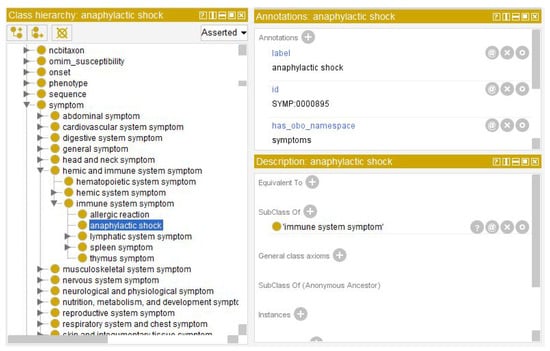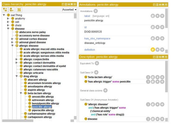 As shown in Figure 4 and Figure 5, the ontological data records for those two keywords are detailed and rich and allow additional semantic knowledge to be extracted from those records and embedded into to the medical record. The resulting new health record is represented in Figure 6, as shown with a basic JSON file reader and merged in one clearly readable data structure (shown in the centre of the figure). All of the original information about not only that one allergy cited above, but about all three types of allergies that the patient was suffering were included. In fact, those allergies’ data were originally split on separate CDA files that were cluttered with XML syntactical artefacts and alphanumeric codes and tags. It also enriched the overall allergies data record with textual descriptions of the terms for related diseases and symptoms, following the semantic connections in the associated ontology (lollipops on the sides of Figure 6). This will help the doctor remember additional drug- and allergy-related concepts, having a handy and valid help to accordingly make a more aware and correct diagnosis. In the centre of Figure 6, there is a table representing the JSONs coming from three HL7 CDA files, each relating to a visit made by the patient, whereas inside the coloured boxes there are data taken from the HDO ontology, offering additional support to the doctor.