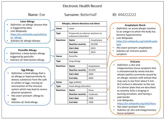 Each clinical document in the EHR of a given patient describes specific clinical information of that patient, e.g., their allergies or vaccines. Thus, once a new CDA document has been processed for data acquisition, a set of labels has been already extracted from it. Those are standardized medical keywords used to unambiguously refer to specific diseases, symptoms, drugs, allergic reactions, etc., that describe the medical story of the patient: the reason for the check, the name and type of the problem encountered, its severity, reactions, date of examinations, etc. Such data can be further enriched with the use of appropriate ontologies. Specifically, we match data extracted from the CDA document with appropriate semantic data extracted from related existing medical ontologies, facilitating doctors’ work, e.g., by offering them readable descriptions of the keyword terms and advice and/or suggestions on further related pathologies, i.e., further allergies, diseases, vaccines, etc.