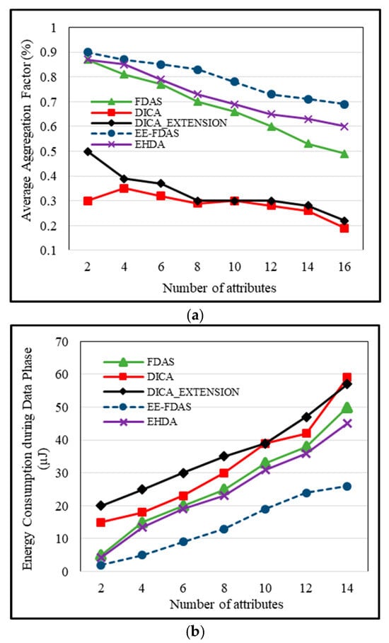The scheme maintains the effectiveness of compression by focusing on preserving crucial information while reducing data size. EE-FDAS minimizes the probability of losing important information by reducing redundant data by changing it with Boolean digits. The rationale behind this approach is that when data is compacted into smaller sizes, the likelihood of data loss during transmission decreases, especially in environments with low bandwidth. By replacing redundant information with Boolean digits, EE-FDAS ensures that the compressed data remains informative while reducing the risk of loss, contributing to the scheme’s overall efficacy in optimizing data size without neglecting critical details. The X-axis represents the number of attributes and the Y-axis shows the average aggregation factor. In Figure 3a, when the number of attributes is 4, the aggregation factor remains 0.3, 0.39, 0.81, 0.85 and 0.87 in DICA, DICA_EXTENSION, FDAS, EHDA and EE-FDAS, respectively.