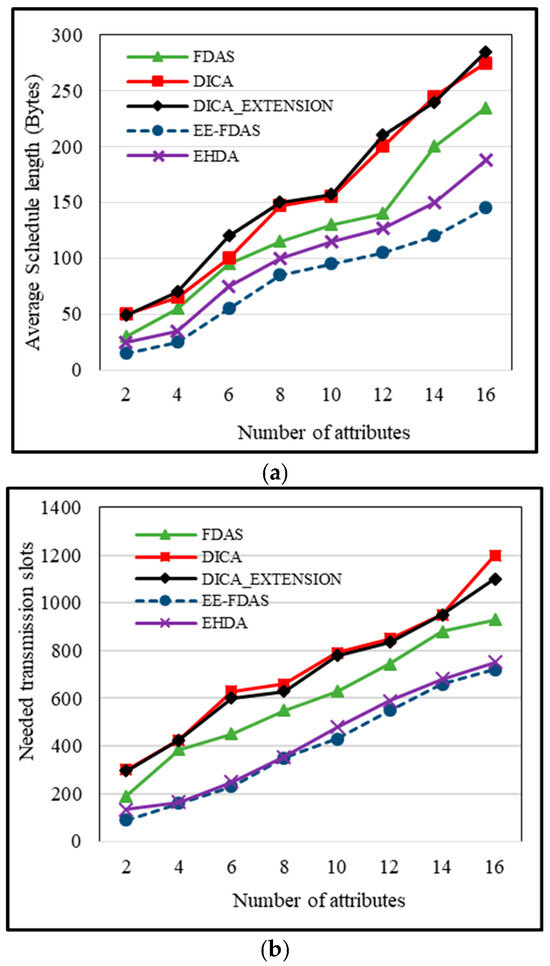 The schedule length (SL) refers to the time needed for sending data from sensor nodes to CHs. When the aggregation factor is high, the SL starts decreasing. This is because proficient data collection results in the minimum time required for sending it to the head node. EE-FDAS achieves a lower SL primarily because of the smaller data size, which effectively increases the level of aggregation and consequently reduces the probability of significant data loss. Both DICA and DICA_EXTENSION demand a longer SL as of lower aggregation, and this requirement remains to increase with the rising complexity of the environment. On the other hand, FDAS and EHDA achieve better SLs because of sustainable aggregation. In Figure 4a, the X-axis shows the number of attributes, whereas the Y-axis signifies the average SL. Due to higher aggregation in EE-FDAS, the SL diminishes to 95 bytes when there are 10 attributes. This SL requirement is 130, 155, 157, and 115 in FDAS, DICA, DICA_EXTENSION, and EHDA, respectively.