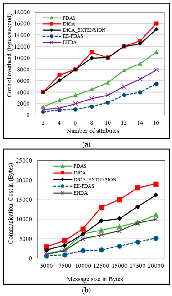 The data packet size directly affects communication costs. The proposed scheme transfers normal data as Boolean digit 0, considerably decreasing the packet size. The small packet lowers the communication cost and overall reduces the chances of packet loss. In FDAS and EHDA, data packets are also small in size, resulting in lower costs as compared to larger data packets. The results of all schemes are depicted in Figure 5b. When a packet size of 1000 bytes is transmitted, FDAS, EHDA, DICA, and DICA_EXTENSION have costs of 6250 bytes, 5000 bytes, 7500 bytes, and 6100 bytes, respectively. However, among all the schemes, EE-FDAS has the lowest cost of 1990 bytes.