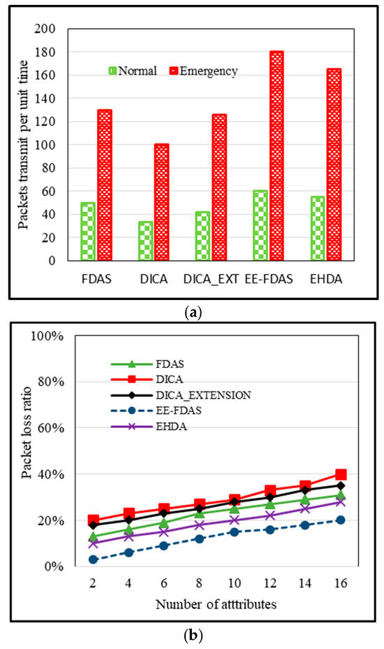 The packet drop ratio discusses the proportion of data packets lost or dropped during transmission. It is an inverse proportion to PDR. Different factors can trigger the dropping of a packet, together with the large size of the data packet. If the packet is small, the chance of dropping is reduced. Furthermore, data packets with large sizes are more prone to being dropped. As in case some data bits are corrupted, leading to the entire message being dropped. If the bandwidth is low, the network can become congested due to large-sized data packets, which in turn starts a higher packet loss. The EE-FDAS has more compressed data, when the size is reduced it lowers the chances of being dropped. As shown in Figure 6b, the proposed scheme retains a lower drop ratio because of smaller data packets. It eases successful data transmission, letting packets be transmitted even when the bandwidth is low. Additionally, only critical data is transmitted in its full form while normal data is sent in Boolean digits. This plays an important role in reducing the drop ratio. In case of the threshold based scenario, the packet size grows only for the a few packets sent after a certain count. In a similar context, EHDA and FDAS also hold low drop rates, while DICA and DICA_EXTENSION experience a higher dropping ratio due to the large-sized packets required to pass through several hops before reaching the parent node. The packet drop ratio remains 73%, 87%, 80%, 53% and 43% in FDAS, DICA, DICA_EXTENSION, EHDA, and EE-FDAS when the attribute count is 12.
