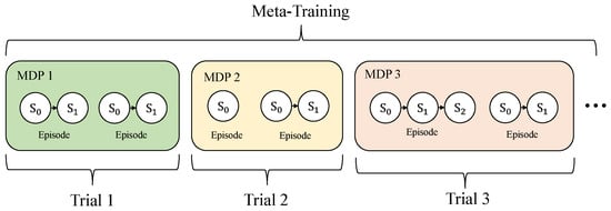 Unlike conventional reinforcement learning approaches that are tailored for singular tasks, meta-reinforcement learning (Meta-RL) aspires to craft policies that are capable of rapid adaptation or optimization when faced with a sparse influx of data from new tasks []. The prevailing methodologies in Meta-RL typically presuppose a task framework where all constituent subtasks are unified by identical state and action spaces. The distinctions among these tasks often emerge through variations in the reward functions, the probabilities of state transitions, or the distributions of initial states. For instance, in the context of robotic object-grasping experiments, diverse tasks may entail the manipulation of different objects within a consistent physical environment. Despite the variability in tasks, the robot’s action space (such as arm movements) and state space (encompassing joint angles and object locations) remain unchanged. Tasks are derived from the distribution , with each task  characterized by . Given the shared framework of state and action spaces across tasks, the task distribution  is delineated by the reward function and the initial state distribution , thus formulated as .