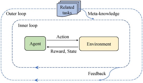 In the meta-reinforcement learning framework (shown in Figure 3), the meta-knowledge accumulated in the outer loop significantly guides the inner loop, helping it adapt more quickly to new tasks. The essence of this learning mode lies in how effectively meta-knowledge can be extracted and utilized from multiple tasks, and how it can be adjusted according to the evolution of tasks, thus enabling the agent to rapidly adapt when facing new tasks. This approach is particularly suitable for scenarios in which the task environment frequently changes or the agent needs to handle a variety of different tasks, enhancing the model’s generalization capabilities.