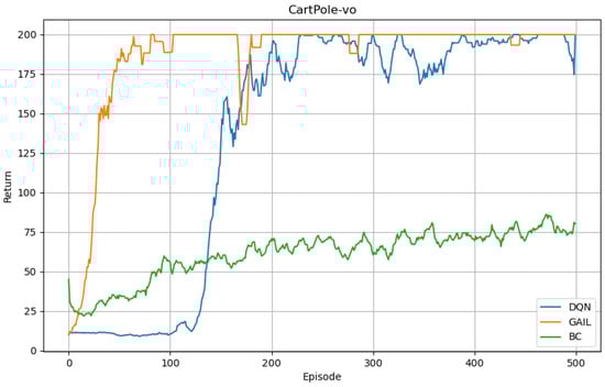 Building on the theoretical framework described, we embarked on a series of comparative analyses involving three distinct algorithms, applied to the Cartpole task. The initial step entailed the generation of expert data, for which we opted for the Proximal Policy Optimization (PPO) algorithm, given the relative simplicity of the Cartpole task. From the generated trajectory, we sampled 30 state–action pairs . Our comparative analysis revealed that the Generative Adversarial Imitation Learning (GAIL) algorithm required merely 80 training epochs to attain the maximum reward threshold. In contrast, the traditional Deep Q-Network (DQN) algorithm necessitated a more extensive trial-and-error approach, taking approximately 200 epochs to reach a comparable performance level. Notably, the training trajectory of the model underpinned by GAIL exhibited greater stability than its DQN counterpart. The outcomes of these experimental endeavors are encapsulated in Figure 4.
