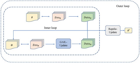 This figure depicts the global architecture of the model, demonstrating how to optimize the parameters of the strategy network through a multi-step iterative process, enabling rapid adaptation to various tasks. The main steps include: (1) Outer Loop: This phase is responsible for updating the meta-parameters . Throughout a series of training cycles, these meta-parameters are used to generate initial strategy network parameters adapted to various tasks. (2) Inner Loop: For each subtask, starting from the meta-parameters , data are generated through interaction with the environment, and the parameters  of the strategy network are iteratively updated using the GAIL algorithm. (3) Parameter Update: After the inner loop training, the task-specific parameters  obtained are used to update the meta-parameters , thus achieving rapid adaptation to new tasks.