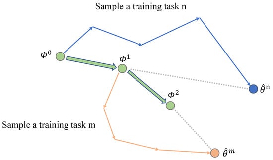 Building upon the experiments previously mentioned, we introduced the Reptile algorithm [] as our chosen method for meta-learning. Reptile is a gradient-based meta-learning algorithm aimed at identifying a set of initial parameters that enable rapid adaptation to new tasks with a minimal number of gradient updates. Its main strategy involves applying gradient updates across various tasks, with the goal of achieving a set of initial parameters that ensures good initial performance across a range of tasks. This approach allows the Reptile algorithm to significantly enhance the model’s adaptability and flexibility when encountering new tasks. The structure of this methodology is depicted in Figure 5.