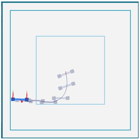 Given the complexity of drone control in three-dimensional space, we opted to conduct experimental tests on a two-dimensional plane. We utilized the experimental environment described in the literature [], which consists of three marked square areas. For detailed information about the specific experimental setup, please visit the following website: https://github.com/marek-robak/Drone-2d-custom-gym-env-for-reinforcement-learning (accessed on 11 December 2023). The smallest square represents the initial space where the drone may appear, while the larger square defines the area where the target point may be located. Here, the agent needs to learn to navigate the drone to the target point. The largest square represents the boundaries of the drone’s flyable space, and if the drone flies out of this range, the current round ends.
