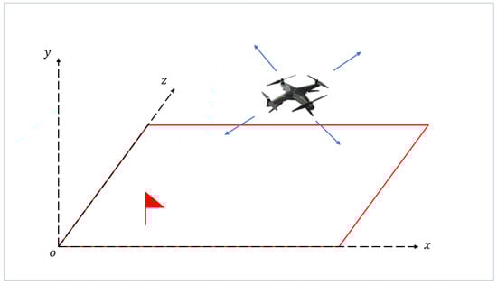 In our study, we strategically simplified the drone’s operational context by confining its movements to the xoz plane, thereby significantly mitigating the complexities associated with navigating a fully three-dimensional space. Within this two-dimensional framework, the drone utilizes its advanced control system to navigate from an initial point to a specified target location. This experimental setup enables a concentrated examination of the drone’s control and navigational efficacy on a plane, alongside an assessment of its stability and task execution proficiency. This methodological choice not only facilitated a comprehensive analysis of the drone’s control system efficiency but also established a foundational basis for future explorations into three-dimensional spatial navigation, yielding crucial data and insights. Figure 8 simulates the drone’s situation in three-dimensional space: