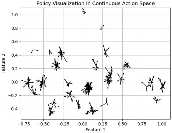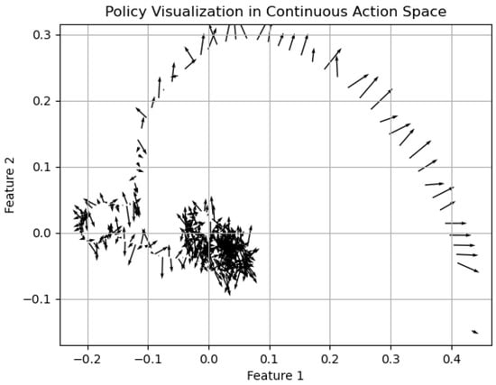 Furthermore, we have depicted our strategy through illustrations in Figure 9 and Figure 10. Given the original eight-dimensional state space, we employed Principal Component Analysis (PCA) to compress it into a two-dimensional space for the sake of clarity in visualization. In the derived visual representation, the orientation of the arrows signifies the actions the model is inclined to undertake in specific states. A concentration of arrows pointing in a uniform direction within certain regions implies a degree of consistency in the model’s action choices in those states. In contrast, a varied spread of arrow directions may indicate the states’ inherent uncertainty or highlight the exploratory behavior of the model during its learning phase. Moreover, the arrow lengths convey the action magnitudes, with longer arrows denoting larger actions and suggesting the model’s heightened assurance in its responses to those states. Conversely, shorter arrows could denote a more tentative or measured approach by the model in certain states.