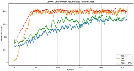 Nevertheless, given the constrained dataset of merely 30 data points, the performance of the Behavior Cloning (BC) algorithm was found to be subpar in comparison to the traditional DQN algorithm, failing to deduce the optimal strategy. This deficiency was predominantly attributed to the model’s propensity for overfitting when faced with such a scant data volume. In essence, the GAIL algorithm demonstrated its efficacy by propelling the model to attain superior performance levels more expediently, utilizing fewer data points and training epochs. Consequently, this underscores the potential merit of integrating the GAIL algorithm within the meta-reinforcement learning framework, especially for UAV tasks where articulating a precise reward function is challenging.