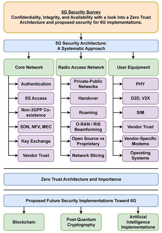 The survey looks into the current methods of security and then compares and contrasts innovative new security mechanisms, like post-quantum cryptography for 5G. Finally, the aspect of Zero Trust networks is explored, expressing yet another future implementation of 5G security with considerations for highly secure communications. A high-level breakdown of what is covered in this survey can be found in Figure 1. Gathering new and trusted methods for security mechanisms in 5G will allow for the recognition of areas where improvements are already available or where additional research is still needed in order to continue working toward a more secure and confidential system architecture.
