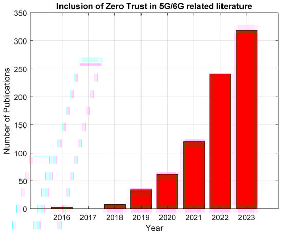 Mentions of the term ‘Zero Trust’ in conjunction with either 5G or 6G in network security-oriented research publications, starting from the year 2016.