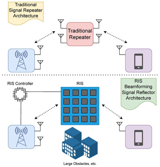 Traditional repeater architecture in comparison with RIS-aided repeating/reflection architecture.