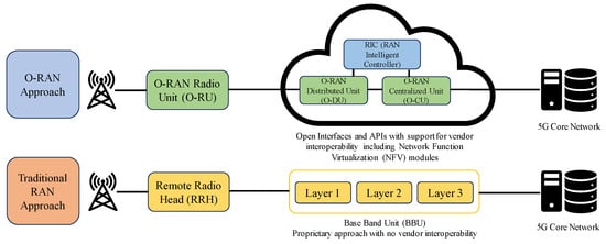 Open Radio Access Network (O-RAN) is a coalition in a new approach to creating a more open, modular, and configurable RAN in cellular networks. Historically, RANs were proprietary monolithic solutions that tied service providers down into choosing equipment from a limited amount of vendors, thus causing concern for constraints in options that are available to address the various demands of a wide variety of networks. These proprietary solutions resulted in a lack of interoperability, which sometimes severely impacted the network’s cost, quality, and efficiency for service providers, as deployments of these solutions could be seen as vendor-locked solutions. Such vendor lock diminished the service providers’ ability to respond to the network’s different requirements at different geological areas due to varying customer usages and applications. Monolithic RANs also limited the amount of centralized control a service provider could exercise on network edge operations, and many control functions were encapsulated within the RAN components. O-RAN seeks to overcome the proprietary nature of the RAN, as well as the lack of central management, by dividing the RAN functionality into different functional elements with well-defined interfaces, thereby enabling the use of interoperable sub-units regardless of the original vendor. Furthermore, many of the functional components can now be realized as software elements and moved further away from the edge for a more centralized and agile RAN operation. Illustrated in Figure 8 are the components of an O-RAN compared to a traditional RAN setup based on a figure presented in [65]. It can be seen that O-RAN has introduced modular components in the RAN and also virtualization features that are referred to as O-vRAN (Open Virtualized RAN).