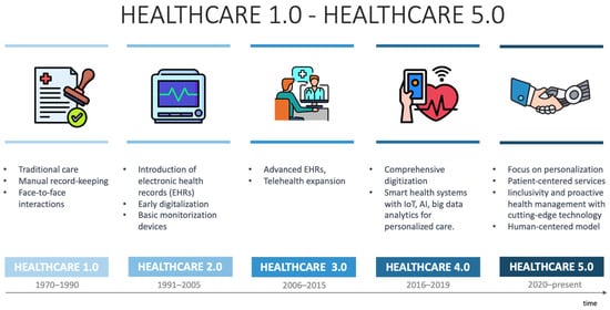 This period saw the introduction of e-health, the adoption of electronic-based medical devices, and the early stage of digital technology for patient tracking and imaging, significantly improving diagnosis, treatment, and healthcare efficiency [,]. The era was characterized by a transition from traditional face-to-face services to a more electronically facilitated healthcare environment, leveraging the power of electricity and technology in Industry 2.0 [].