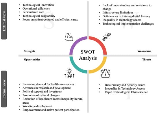 SWOT analysis will help identify management strategies to meet the challenges of integrating I5.0 into healthcare, exploit the opportunities it offers, and minimize the threats to its success. This way, this analysis allows leaders to develop more effective strategies, make informed decisions, and identify areas that need improvement or adjustment. As mentioned by Selvam et al. [], “This is just the tip of the iceberg, as there are more advancements to come in the near future in this avenue”.