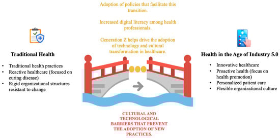 I5.0 ushers in a dynamic change in healthcare, from traditional methods to personalized, technology-driven care. This new paradigm improves the relationship between patient and healthcare professional, moving from hierarchical to collaborative, and changes treatment from standardized to individualized, integrating technology. Despite the technological basis, care remains human, focusing on personalization, efficiency, and empathy. The transition faces obstacles such as resistance from professionals, but the digital fluency of Generation Z and management and government strategies will help adopt new practices. Policies that support digital literacy among professionals, equitable access to technology, and the development of telemedicine are key to a smoother transformation. This change, symbolized by a bridge in Figure 4, marks the progress from resistance to innovation, pointing to a future of resilient and flexible healthcare. Technology and I5.0 are not the solution to all issues; it is essential to implement practices in the social sphere and raise awareness among government bodies of the need to create mechanisms and solutions to help mitigate the problem. In conclusion, it can be stated that one of the most significant transitions in Health 5.0 is the shift from an emphasis on sickness to wellness.