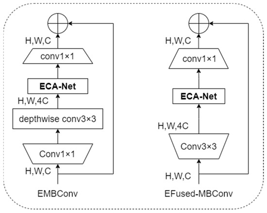To improve the feature extraction capability and robustness of the model and focus more on the information of practical feature areas in the image, this article designed the EMBConv module and EFused-MBConv module concerning the EfficientNetV2 model structure. The structures of the EMBConv module and EFused-MBConv module are shown in Figure 5.