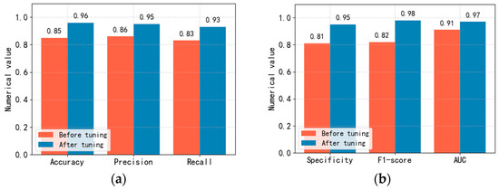 Comparison of accuracy, precision, recall, specificity, F1 score and AUC values before and after adjustment of Linge model parameters. (a): Comparison of accuracy, precision and recall. (b): Comparison of specificity, F1 score and AUC value.
