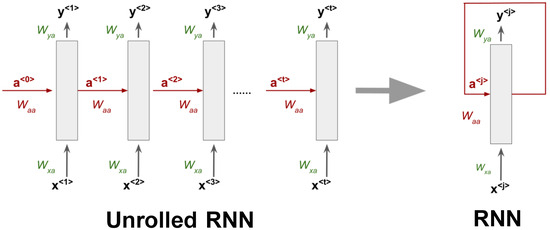 A Recurrent Neural Network (RNN) is a deep learning architecture that aims to process sequences of values in the form , .…., . This ability is due to the network’s parameter sharing across different parts of a model, which makes it possible to extend and apply the model to examples of different forms. Moreover, parameter sharing also allows the model to preserve generalization across the sequence since the same parameters (weights) are used for each value of the time index, while a traditional fully connected feed-forward network would have separate parameters for each input feature. The time index refers to the position in the sequence. A Recurrent Neural Network is generally composed of a single unit of processing that produces an output y at each time step and has recurrent connections in general from the hidden units and optionally from the output. When an RNN has only recurrent connections from the hidden units, it processes an entire sequence and then produces a single output. Figure 1 shows a generic RNN structure that processes a sequence of t elements with recurrent connections only from the hidden units. Input, output, and recurrent hidden states are propagated using different weight matrices whose elements are learned during training via the back-propagation through time algorithm [33]. Equations (1) and (2) describe the internal behavior of an RNN unit. The initial hidden state is generally equal to zero. In general, for a generic time index j, the hidden state is computed as a weighted sum of the previous state and the current input plus a bias term. After that, an activation function is applied to the result as in fully connected networks. The output at each time step only depends on the current internal state plus a different bias . The two activation functions to estimate the hidden state and the output may differ. Additionally, the weight matrices , , and play crucial roles in the computations: