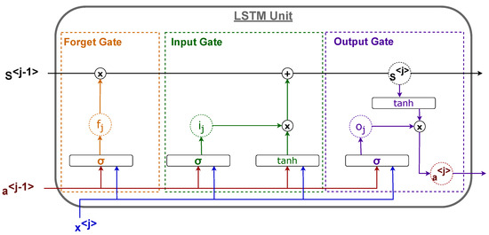 In this way, Recurrent Neural Networks can process entire sequences and can use contextual information when mapping inputs into outputs. Unfortunately, for standard RNN architectures, the range of context that can be in practice is quite limited, especially for long sequences and for more than one sequence in the input (matrix input). The major issue is that the influence of a given input on the hidden state, and therefore on the network output, either decays or blows up exponentially as it cycles around the network’s recurrent connections. This effect is often referred to in the literature as the vanishing gradient problem [34]. Several approaches have been presented to solve this issue like the Long-Short Term Memory (LSTM) architecture [35] and the Gated Recurrent Unit (GRU) [36]. In both architectures, several additional components (called gates) are introduced inside the unit to extend the memory of the network in case of a long sequence so that the first part of each sequence is not forgotten when producing the output (long-term dependency problem) and to prevent the gradient from vanishing. We describe LSTM since it is the architecture used in this research work and because the GRU unit can be taken back to a particular case of the LSTM unit. The basic idea is to employ a unit state to retain the information taken from earlier time indexes in the sequence. The unit is composed of three gates: