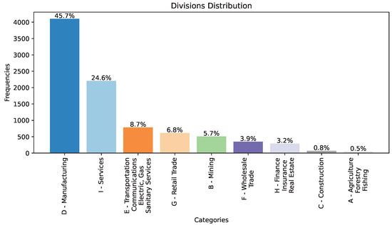 Moreover, each company in the dataset was categorized using the Standard Industrial Classification (SIC) system, developed by the US government to classify businesses based on their primary economic activities. The SIC codes not only distinguish firms but also enable more granular categorization by specifying major groups within each firm [40]. Major groups represent specific subcategories that define the business-type activities undertaken by these companies. The inclusion of SIC codes and major groups allowed us to conduct a deep analysis of bankruptcy trends across a wide range of industries. This classification system helps researchers and analysts gain insights into the economic factors and market dynamics affecting various sectors of the American economy, making it a valuable resource for studying bankruptcy patterns and their implications for different industries and major groups. Additionally, we generated the frequency distribution chart in Figure 4 to represent the companies’ distribution across different divisions within our dataset. This histogram provides a clear overview of the prevalence of companies in each division, highlighting which sectors of the economy were more heavily represented among the bankrupt firms. It helped us evaluate the overall dataset composition and identify any potential trends or disparities in bankruptcy occurrences across divisions. In this work, we performed a comprehensive examination of the dataset, with a particular focus on the division distribution.